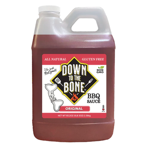 Down To The Bone Original BBQ Sauce is an all-natural, sweet and tangy style BBQ sauce that pairs well with just about everything. It contains no artificial flavors, colors, or preservatives and is 100% Gluten Free.